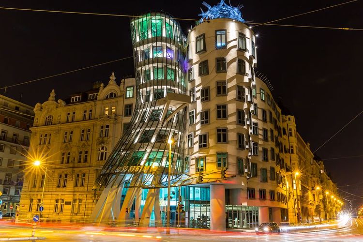 Das Tanzende Haus, auch als Ginger & Fred bekannt, ist ein modernes architektonisches Meisterwerk in Prag, Tschechische Republik. Das Gebäude wurde von den Architekten Frank Gehry und Vlado Milunić entworfen und 1996 fertiggestellt. Die Idee hinter dem Tanzenden Haus war es, einen Kontrast zur umliegenden historischen Architektur zu schaffen. Die meisten Gebäude in der Nähe stammen aus dem 19. Jahrhundert, und das Tanzende Haus sollte ein Beispiel für zeitgenössische Architektur in dieser Umgebung sein. Das Gebäude besteht aus zwei Türmen, die an ein tanzendes Paar erinnern sollen. Der Turm auf der rechten Seite stellt Fred Astaire dar, einen legendären Tänzer und Schauspieler, und der Turm auf der linken Seite stellt Ginger Rogers dar, seine Tanzpartnerin. Die Gebäudeformen sind geschwungen und organisch, was dem Gebäude seinen einzigartigen und auffälligen Charakter verleiht.
