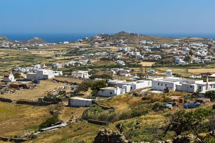 Ano Mera ist eine kleine landwirtschaftliche Siedlung, die mit dem Land verbunden ist, obwohl es auf Mykonos ganz geschält ist. Die kleinen Landstraßen rund um das Dorf führen durch Parzellen, die immer von Steinmauern begrenzt sind und auf denen man manchmal einem Esel oder ein paar Ziegen begegnet. Die Häuser sind verstreut, denn Ano Mera verstreut sich, nimmt den gesamten zentralen Bereich der Insel ein und bietet stellenweise einen schönen Blick auf die Küste und die Ägäis.